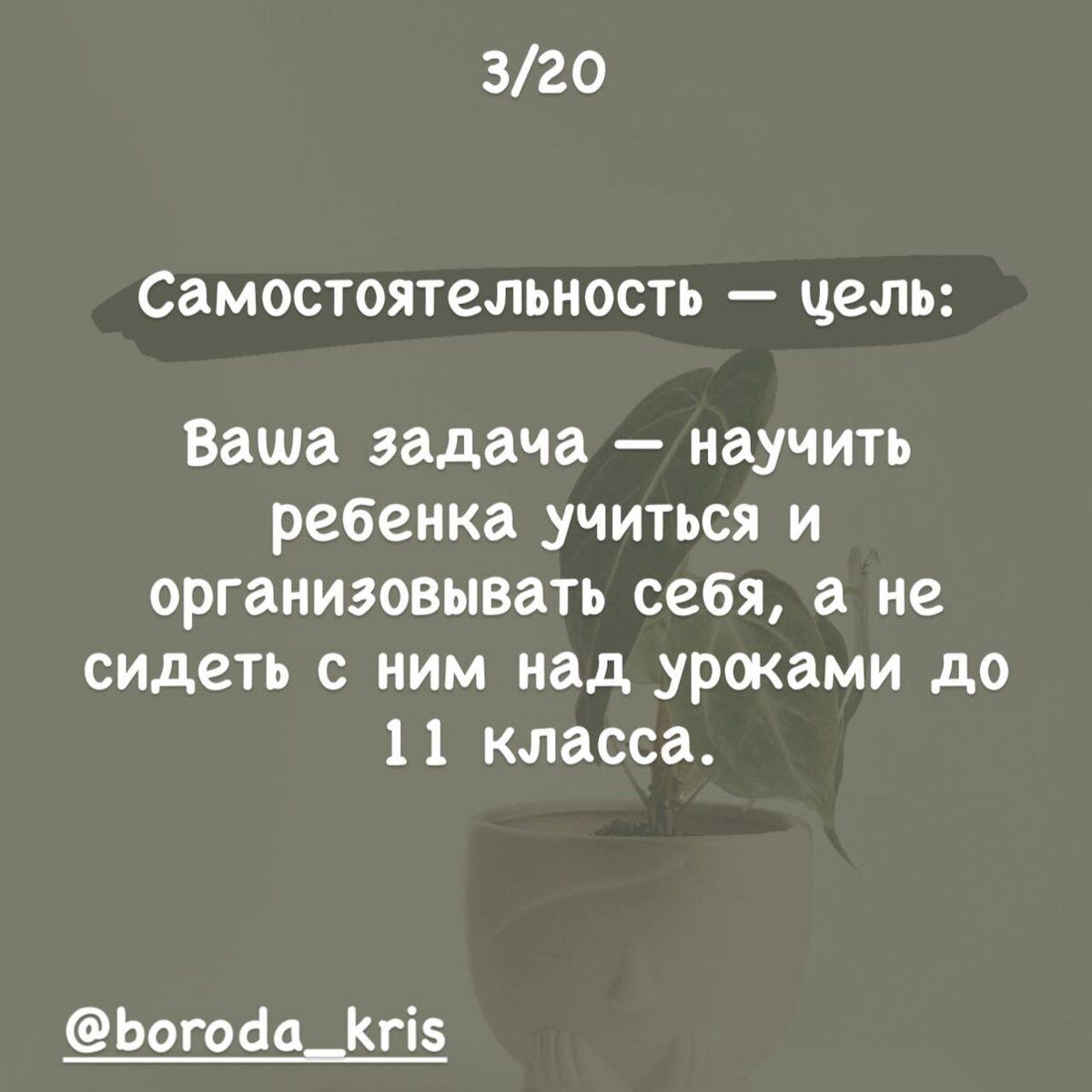 Главная задача родителей - научить ребёнка быть самостоятельным) Здесь так же задавайте себе вопрос: «А это помогает его самостоятельности или мешает?») А если это не сделать, то потом в универ и на работу будете его будить) и контролировать надел ли он шапку в 25 то лет) реально больше нечем заняться? Вокруг столько всего! Мы даже 10% за жизнь не успеваем охватить мне кажется)