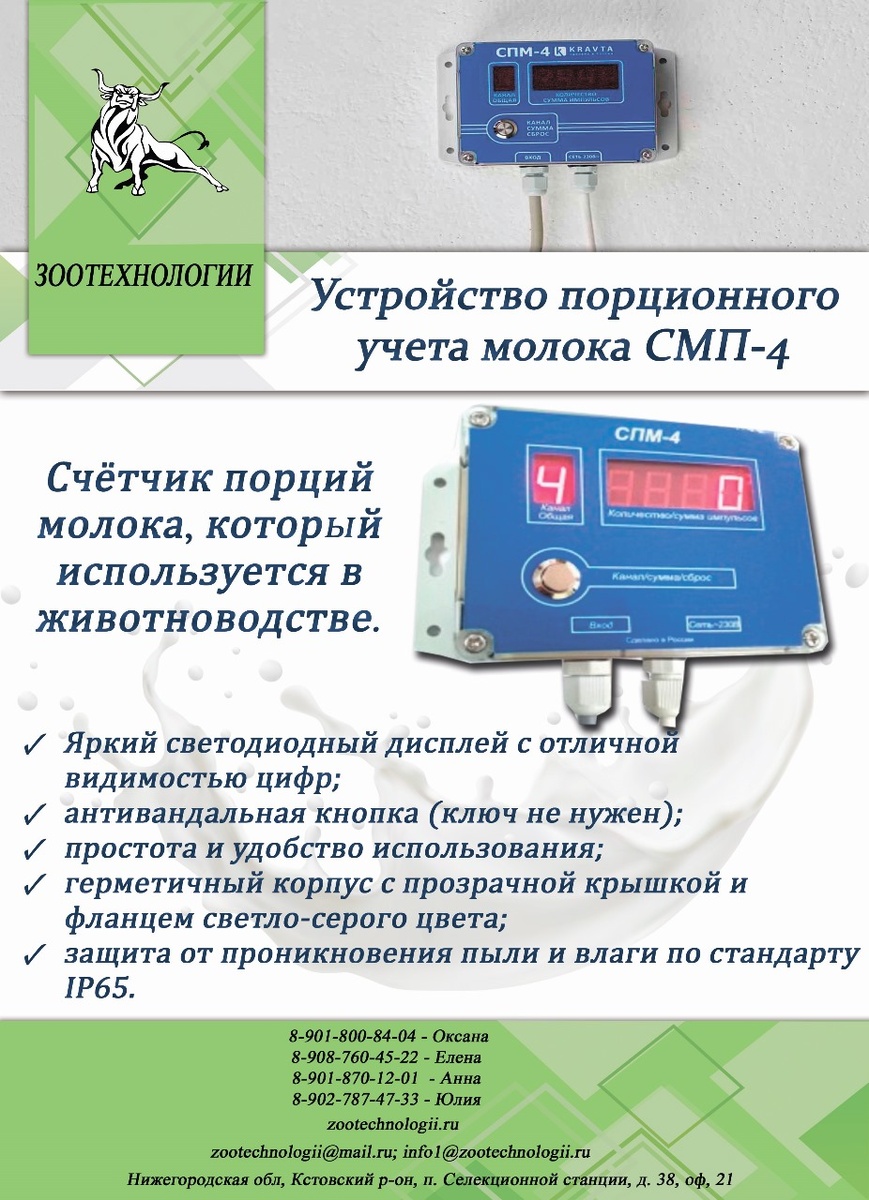 В продаже счётчик молока СПМ-4 (счётчик порций молока), который предназначен для группового учёта молока в животноводстве. Устройство используется на стационарных доильных установках, оборудованных дозаторами молока.