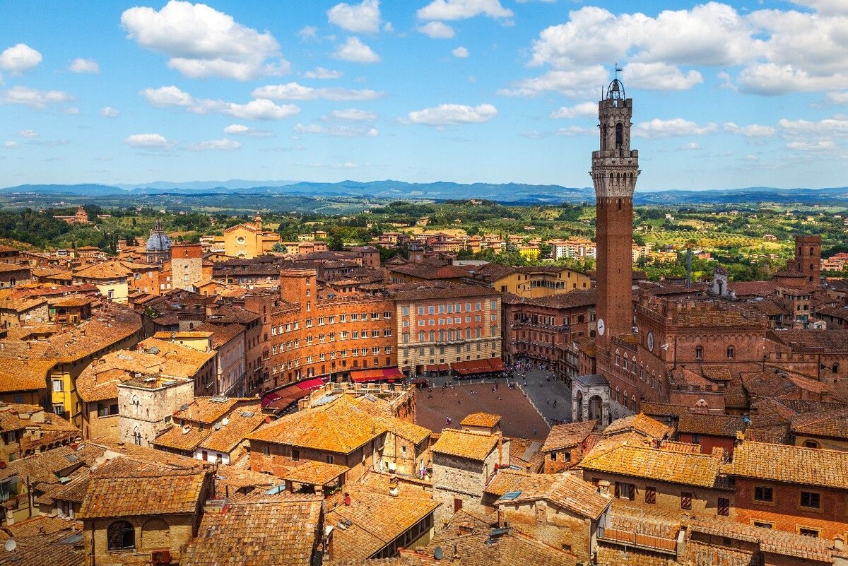 Сиена — это прекрасный город в итальянском регионе Тоскана. Символом Сиены, как и Рима, является Капитолийская волчица. На гербе города изображены младенцы Ромул и Рем, сосущие волчицу. Как гласит легенда, близнецы укрылись на тосканском холме, где позднее и был построен город, получивший свое название Сиена. Сиена сохранилась в первозданном виде с XII века. В открытых окнах домов, можно увидеть старинные росписи на потолках. Город совсем небольшой и его можно обойти за несколько часов, но лучше с собой иметь карту, т.к. легко заблудиться среди старых узких улиц и переходов. Главная достопримечательность города – это площадь Дель Кампо. Она имеет форму раковины и своей необычной формой известна на весь мир. Считается хорошей приметой посидеть на площади и загадать желание, оно непременно сбудется. Что мы, конечно же, и сделали. Присели, загадали желание. Потом перекусили, любуясь на башню Обжоры, прозванную так из-за монаха, который жил в башне и не х