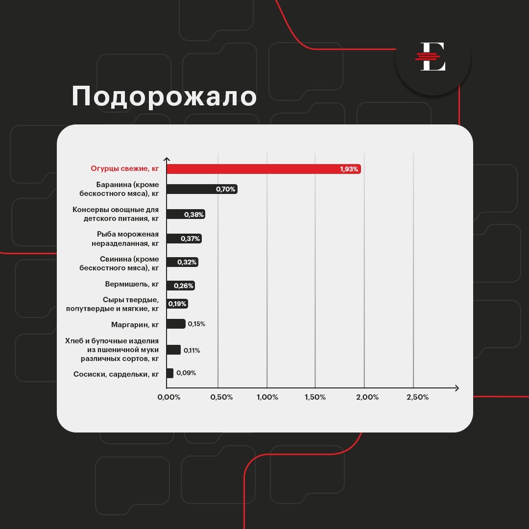 🥒 Больше всего выросли цены на свежие огурцы: +%1,93%