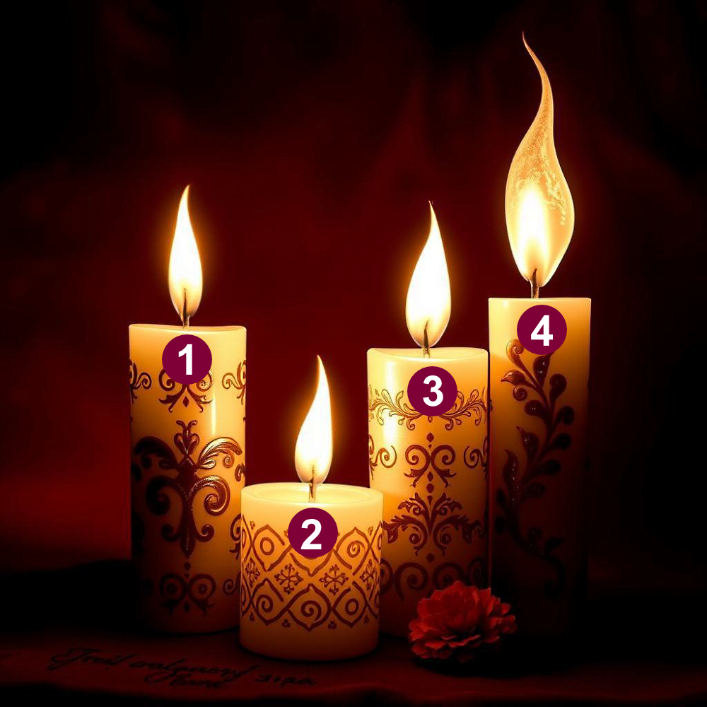 Перед вами четыре свечи. Они разные по форме, рисунку и языку пламени, но каждая несёт особое послание, связанное с вашей судьбой. Выберите ту, которая притягивает взгляд сильнее остальных. Первый отклик сердца и есть самый верный.