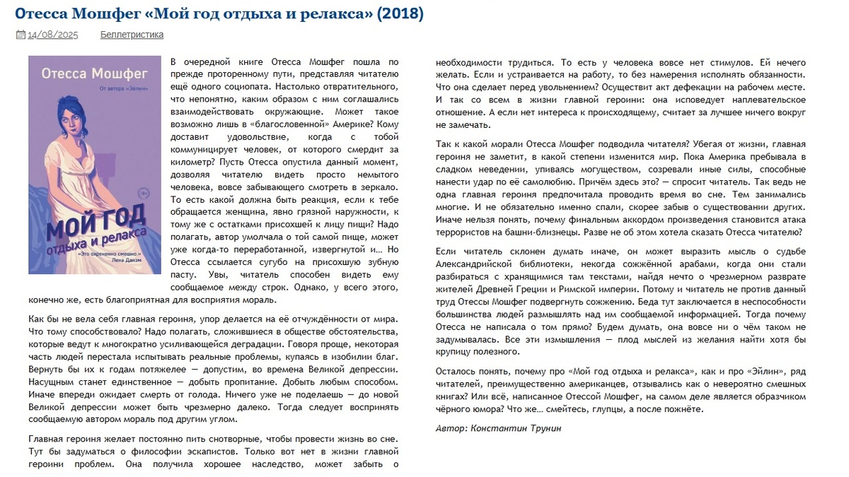 Oтесса Мошфег «Мой год отдыха и релакса» Критика