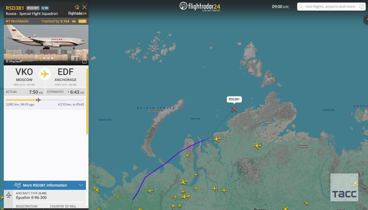 🪂 Спецборт Ил-96 вылетел из аэропорта Внуково и направляется на базу Элмендорф-Ричардсон, которая находится в Анкоридже на Аляске
