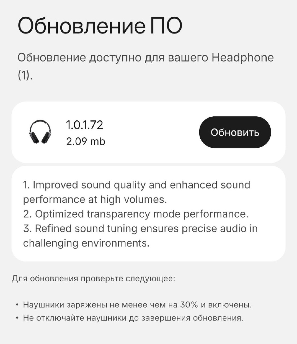 Nothing выпустила обновление 1. 0.1. 72 для наушников Headphone (1), которое заметно улучшило их звучание Если раньше многие жаловались на мутный звук «из коробки» и советовали качать чужие пресеты эквалайзера, то теперь всё стало проще — лишний бас и гул в режиме шумоподавления исчезли, прозрачность повысилась, а общая подача стала чище и ровнее. Теперь наушники раскрывают свой потенциал без долгих танцев с настройками, и оценить разницу можно уже после установки патча весом всего 2 МБ.