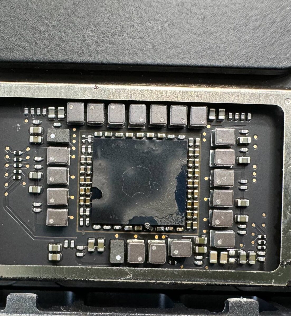 Второй случай такой. MacBook Pro 14” A2442 был залит. Неудачное залитие, попало на шим питания 3,8В, всё по этой цепи сгорело. В том числе оба КП и процессор.