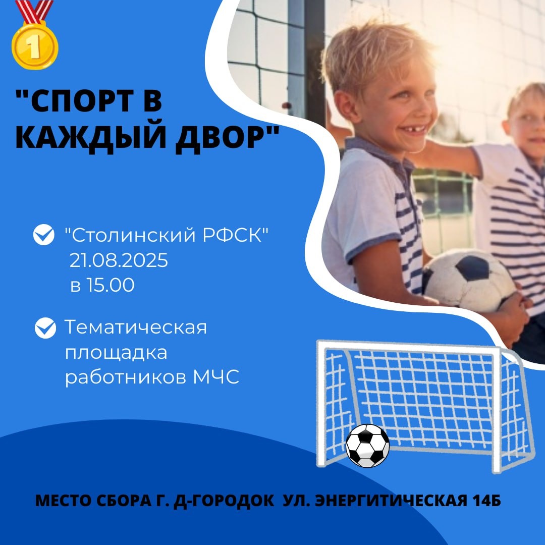 В рамках мероприятий "Полезные каникулы" учреждением "Столинский РФСК" 21.08.2025 в 15.00 будет проводиться спортивное мероприятие "Спорт в каждый двор", а также будет организована тематическая площадка работников МЧС. Всех участников мероприятия ждут сладкие призы. Место сбора г. Д-Городок ул. Энергитическая 14Б