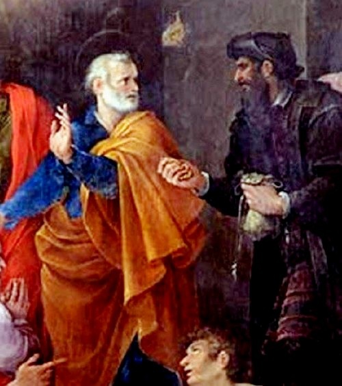 Симон Волхв родился в Самарии, он был современником Иисуса Христа. В Деяниях апостолов (Деян. 8, 4–25) рассказывается, как Симон, успешно практиковавший магию, узнал о творимых Иисусом чудесах и пожелал купить себе такую же способность, чем прогневил апостолов. Согласно раннехристианским «Деяниям Петра», между Петром и Симоном Волхвом разгорелся спор о том, что такое волшебство и истинные чудеса. Показывая свою магию, Симон якобы продемонстрировал на Римском форуме, перед императором Клавдием и разинувшей рты толпой, свою невероятную способность летать. Петр же собрал христиан, и те принялись истово молиться, чтобы Симон упал. Завязался воздушный бой между магией и мистикой. Победил Петр, Симон упал и испустил дух. Для христиан падение Симона Волхва служит подтверждением превосходства христианства над всеми другими верованиями. Связанный с этим эпизодом термин «симония» означает покупку и продажу за деньги или за протекцию церковных и духовных благ (благословений или церковных долж