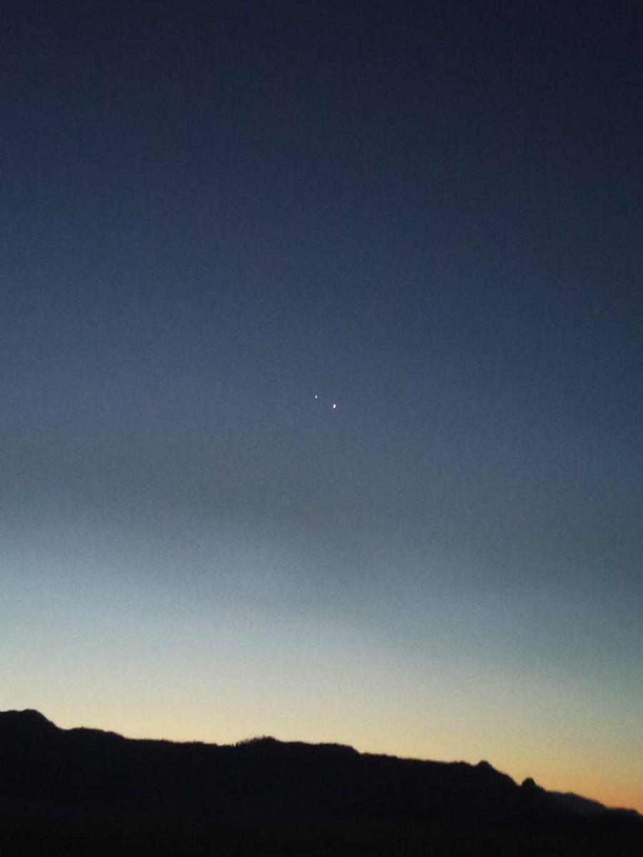 В ночь с 11 на 12 августа в небе можно было наблюдать редкое астрономическое событие: два самых ярких объекта небесной сферы — Венера и Юпитер — оказались на минимальном расстоянии менее 1-ого градуса. *Мы как раз возвращались домой с гор. И вот такой снимок был сделан❤️