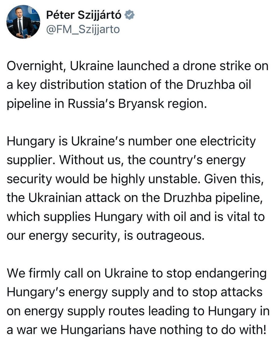 Глава МИД Венгрии Сийярто: Ночью Украина нанесла удар с помощью беспилотника по ключевой распределительной станции нефтепровода «Дружба» в Брянской области России. Венгрия — поставщик электроэнергии номер один для Украины. Без нас энергетическая безопасность страны была бы крайне нестабильной. Учитывая это, украинское нападение на трубопровод «Дружба», снабжающий Венгрию нефтью и жизненно важный для нашей энергетической безопасности, возмутительно. Мы решительно призываем Украину прекратить ставить под угрозу энергоснабжение Венгрии и прекратить нападения на пути поставок энергоносителей, ведущие в Венгрию, в войне, к которой мы, венгры, не имеем никакого отношения! 👊 НАСОНОВ 🔴