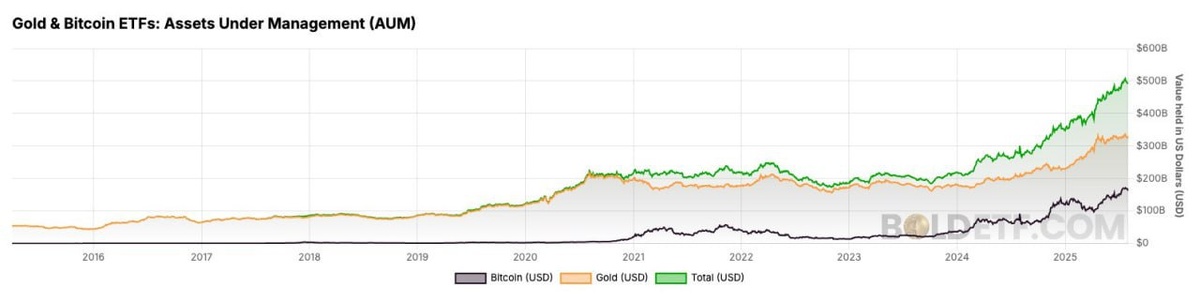 💰🚀 Bitcoin & Gold ETFs just smashed the $500B mark! While gold is still the heavyweight champ, Bitcoin ETFs have skyrocketed with an 8x