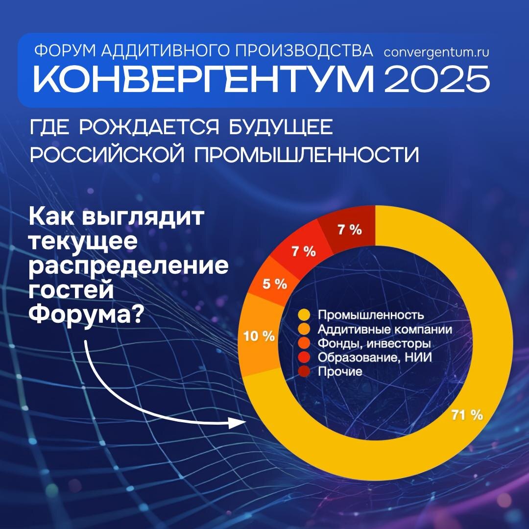 💎 Отличные новости с Форума «Конвергентум 2025»! 🔥 Только что получили свежие данные о составе зарегистрированных участников, и они красноречиво говорят о том, куда движется российская промышленность. А движется она прямиком в Москву, кластер «Ломоносов», Раменский бульвар, 1! Делимся цифрами: 🏭 Промышленность: 71% (крупные и средние предприятия реального сектора) 😀 Аддитивные компании: 7% (производители оборудования, материалов, сервисные бюро) 💼 Фонды и инвесторы: 7% (те, кто вкладывает в технологии будущего) 🎓 Образование и НИИ: 5% (наука, вузы, исследовательские центры) 👀 Прочие: 10% (госструктуры, СМИ, отраслевые ассоциации) Что это значит? ➡️ Фокус на реальном секторе: подавляющее большинство гостей — представители промышленных предприятий. Это прямой сигнал: аддитивные технологии перешли из стадии экспериментов в стадию внедрения в реальное производство. ➡️ Интеграция цепочки: присутствие всех ключевых игроков (от науки и разработчиков до инвесторов и конечных потребит
