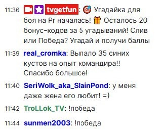 🎁 Бонус-коды на стриме! Команда, многие из вас уже знают, что на моих стримах можно урвать бонус-код, но для новичков это, возможно, станет открытием. И главное — способы получения не банальные: 1️⃣ Розыгрыш по таймеру В конце таймера чат дружно пишет команду !розыгрыш, и бот выбирает случайного зрителя. Победитель получает код мгновенно в личку Telegram. Фишки формата: ✅ Розыгрыши идут весь стрим: таймер перезапускается сразу после каждого победителя. ✅ Донат ускоряет таймер увеличивая их количество в стриме. ✅ Запустить розыгрыш из чата может любой зритель. Подробнее про команды — тут. 2️⃣ Угадайка с призами Каждый бой — мини-игра: угадай исход (!слив или !победа). Скриншот выше. Первые 20 зрителей, набравшие 5 точных прогнозов, получают код в личку Telegram. 💬 Вопрос к вам: Какой способ вам нравится больше? Пишите в комментах или жмите на вариант в опросе! А если есть идеи, как сделать розыгрыши ещё веселее — делитесь. P.S. Да, оба способа завязаны на Telegram, чтобы бот “Ста