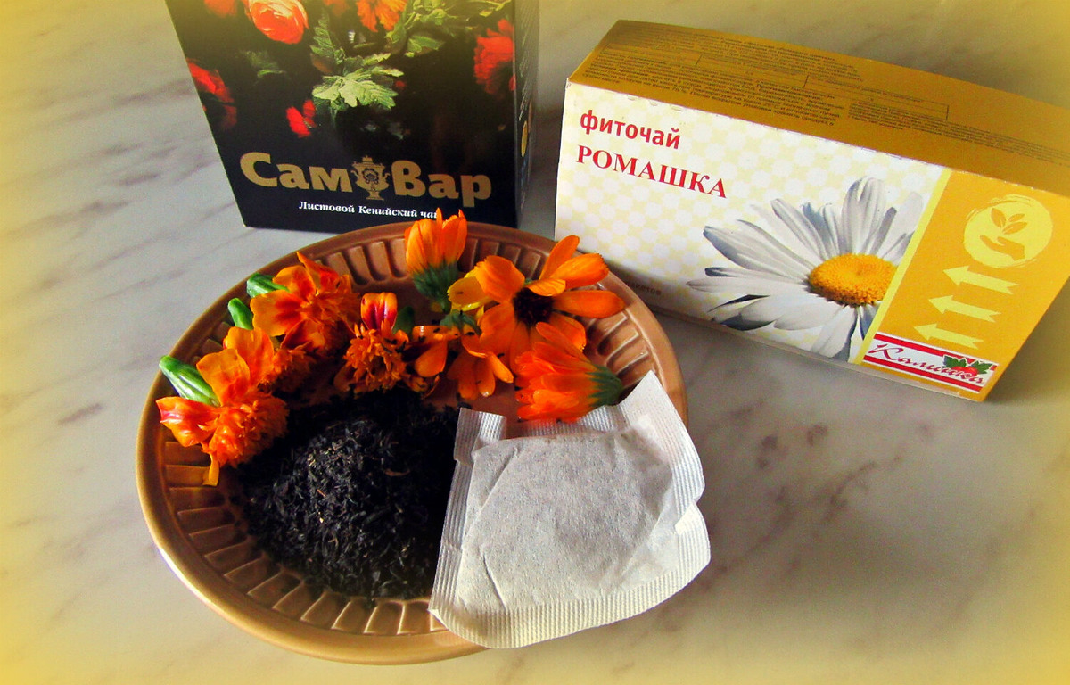 Здравствуйте, дорогие читатели! Поздравляю вас с Медовым Спасом и предлагаю интересный рецепт чая. Почему я назвала его солнечным? В нём цветы солнечной расцветки, его настой светится янтарём, и в чашку добавляется ложечка мёда, напоминающего солнечный свет)) Традиционно предупреждаю - перед тем, как заваривать чай, убедитесь, что у вас нет противопоказаний для входящих в состав компонентов. "Сладким солнцем" мы уже запаслись - как обычно, купили у местного пчеловода две трёхлитровые банки отличного цветочного мёда, этого нам хватает как раз на год. Остальные компоненты для сегодняшнего чая ищу на цветочных грядках и на полочках кухонного шкафа)) Сегодня для сотворения солнечного напитка понадобится: А пока чай настаивается, напомню о полезных свойствах травок. Календула - сильное противовоспалительное и укрепляющее иммунитет средство. Бархатцы - кладезь витаминов, особенно витамина А, благодаря чему наш чай полезен для зрения. Ромашка успокаивает, улучшает пищеварение, и тоже соде