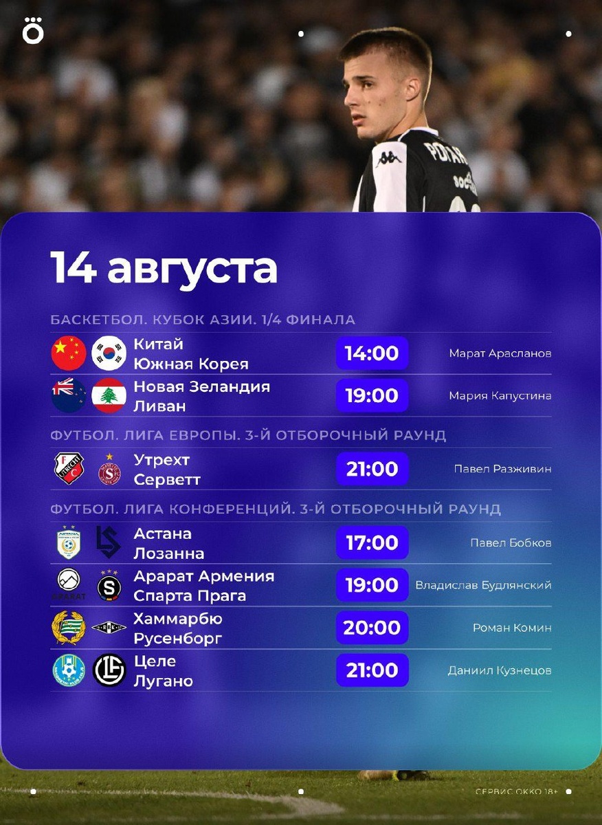 Не прощаемся с еврокубками на этой неделе. Смотрим 3-й отборочный раунд Лиги конференций 🏆 А еще включаем Кубок Азии по баскетболу, 1/8 финала Кубка Либертадорес, Кубок России и предсезонку в хоккее. 🔥 Весь спорт в Okko: https://okko.tv/s/4ot