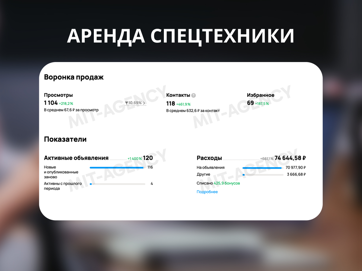 MIT Agency - эксперты по рекламе на Авито, которая приносит реальные заказы. Аренда спецтехники - одно из наших ключевых направлений, с которым мы работаем уже более 1,5 лет. За это время мы выстроили стратегию, позволяющую получать десятки и сотни обращений ежемесячно в городах любого размера. ⏳ Время чтения: 5 минут Аренда спецтехники - востребованная и стабильная ниша. Спрос есть в каждом городе России, а в крупных регионах поток обращений легко может превышать 100-150 заявок в месяц. ⭐ Особенность направления - высокая вероятность повторных заказов: если клиенту понравился уровень сервиса, он будет обращаться снова, а долгосрочные контракты становятся нормой. Что можно продвигать через Авито в этой нише: