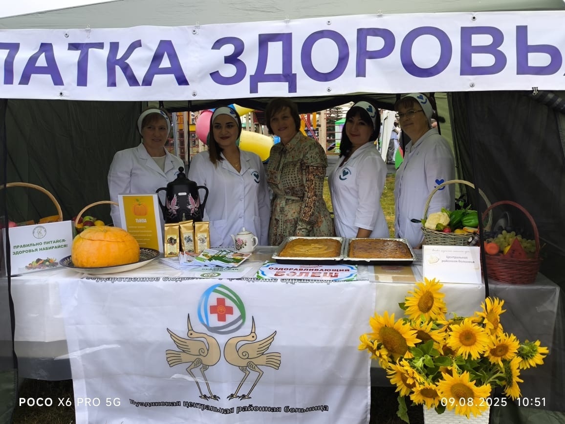 «Палатка здоровья» На одной из площадок праздника национальной кухни работала «Палатка здоровья», где все желающие могли получить рекомендации от медицинских работников Буздякской центральной районной больницы по здоровому образу жизни и профилактике различных заболеваний. Желающие могли измерить артериальное давление, рост, вес, а также ознакомиться с корзинами правильного питания. Специалисты также напомнили о важности прохождения диспансеризации.