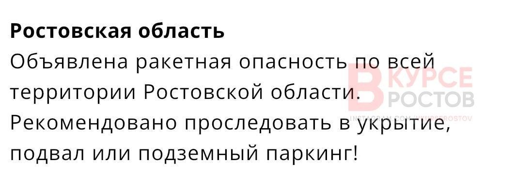 ❗Объявлена ракетная опасность на всей территории Ростовской области