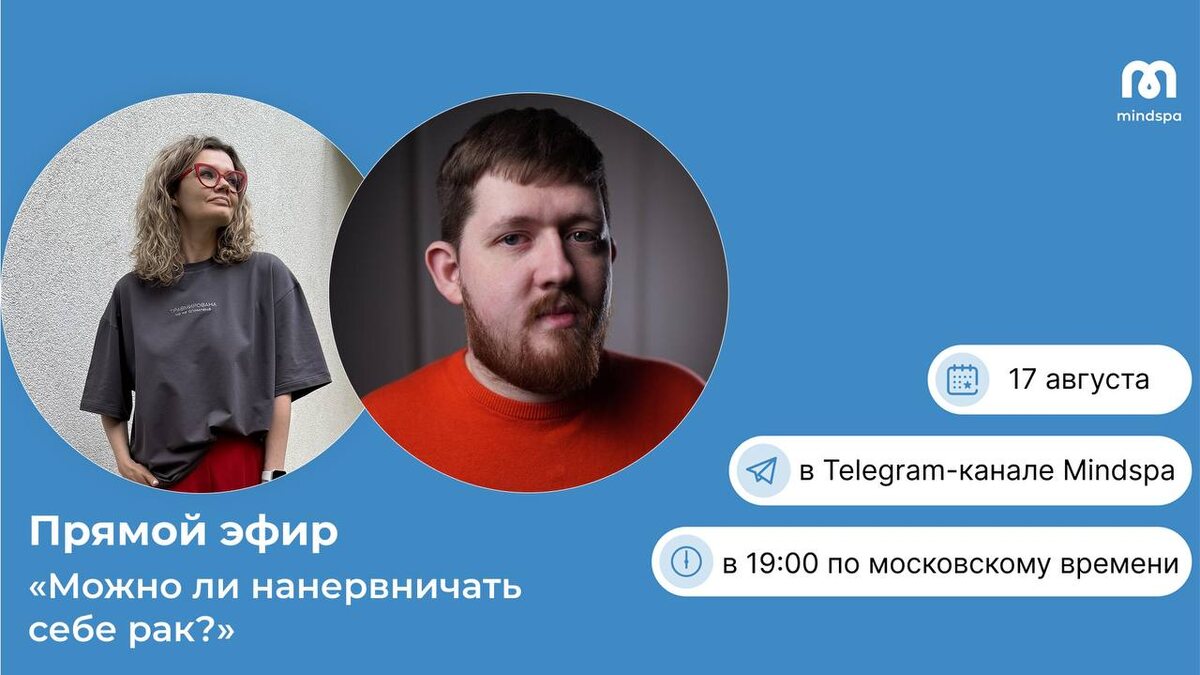 ‼️ Что будет 17 августа? ‼️ 17 августа в нашем Telegram-канале пройдет прямой эфир на тему: «Можно ли нанервничать себе рак?» На нем мы разберем мифы о психосоматике рака и расскажем, какие методы лечения стоит обходить стороной, а на какие профилактические меры обратить внимание. Спикеры эфира: ▪️ Ника Набокова — CEO Mindspa ▪️ Максим Котов — врач-онколог, кандидат медицинских наук, автор книги «Правда о раке», попечитель и эксперт фонда «Не напрасно» Обязательно приходи на этот эфир, если: — тебя волнует твое здоровье, и ты хочешь понимать, как снизить риски; — ты слышал(а) про «психосоматику рака» и хочешь узнать, что из этого — правда, а что — миф; — ты хочешь знать методы раннего обследования и профилактики. ❓ Если хочешь задать свой вопрос эксперту и получить конкретные рекомендации, напиши его в комментариях к этому посту (только не затягивай, чтобы его успели разобрать). 🗓️ Дата: 17 августа, в 19:00 по московскому времени 📱 Эфир пройдет здесь, в Telegram-канале Mindspa