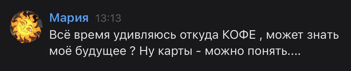 💫 Откуда кофе знает мое будущее? Вот такой вопрос я получила на днях (на скрине). Это абсолютно нормальный и даже очень правильный вопрос. Ведь мы привыкли, что магические инструменты — это карты, руны, свечи… А тут — обычная чашка кофе. Хочу поделиться с вами одной историей. Я всегда относилась к кофейной гуще с любопытством, но без особого трепета. Да, красиво, да, по-восточному, но ведь у меня есть Таро, Руны, да и магия часть меня. Зачем ещё кофе? Всё изменилось одним морозным вечером. Я пришла в гости к подруге — просто выпить кофе и поболтать. Она заварила кофе по-турецки, с густым ароматом, как в старых фильмах. Мы пили, смеялись, и в какой-то момент она сказала: — Давай я тебе погадаю на гуще. Я согласилась. Она перевернула мою чашку и замерла. — Смотри, здесь дорога… длинная, как лента. И вот… мужчина… он ждёт тебя. Я отмахнулась, но через пару недель всё сбылось: у меня действительно была неожиданная поездка, и именно там я познакомилась с человеком, который сильно и