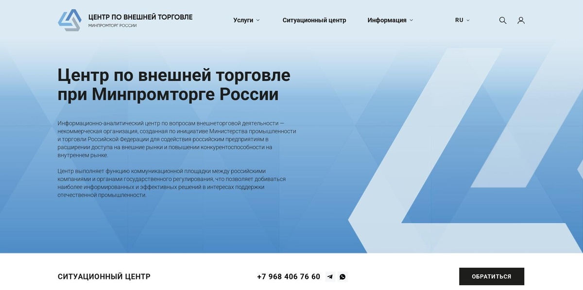 «Центр по внешней торговле» окажет содействие экспортерам Минпромторг России информирует о возможности обратиться в информационно-аналитический центр по вопросам внешнеторговой деятельности — АНО «Центр по внешней торговле». Цель организации – содействие предприятиям в выходе на внешние рынки (сбор и анализ информации о методах поддержки экспорта и субсидирования, барьерах во внешней торговле; комплексная экспертиза проблем внешнеторгового и внешнеэкономического характера и подготовка рекомендаций; помощь в экспортном планировании) и повышение их конкурентоспособности на внутреннем рынке. Основная коммуникация Центра - через telegram-канал (https://clck.ru/39owGV), где размещаются анонсы мероприятий, изменения в законодательстве зарубежных стран, влияющих на ведение внешнеэкономической деятельности и другое. Контактное лицо - руководитель проектов Леонтьев Леонид Михайлович (тел.: +7(985)3520043), контактный центр (тел.: +7(968)4067660). Сайт: http://ftac.ru.