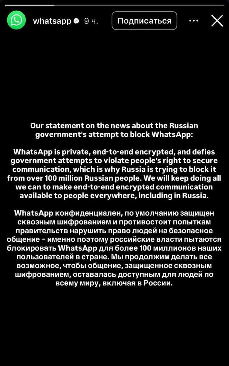 В ответ на ограничение звонков Роскомнадзором WhatsApp заявил, что власти пытаются заблокировать мессенджер за противостояние попыткам правительств «нарушить право людей на безопасное общение». Компания напомнила о 100 миллионах пользователей в России и пообещала продолжать «делать все возможное, чтобы защищенное общение оставалось доступным для людей по всему миру». https://bg.ru/bg/business/comm-news/28904-whatsapp-zvonki ❤️ «Большой Город»