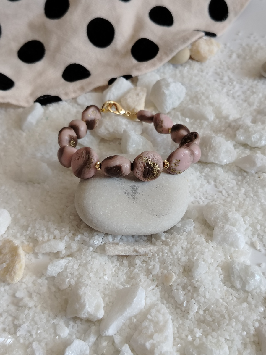 Некоторые мои идеи ждут своего часа очень долго. Браслет такого плана - около двух лет, например. Я давно хотела создать браслет с бусинами, похожими на обычные камни - с шербинками и выбоинками. Только цвета поярче, тем те, что мы видим на земле и тротуарах) Только я не совсем понимала, как красиво сделать эти неровности. И вдруг - бинго! Вот же ж! Полимерная, глина, позолоченная фурнитура. Браслет 2200 руб. Серьги гвоздики 1100 руб. Мне очень понравился коричнево-бежевый цвет с розоватым оттенком. Как вам браслет и серьги? Однажды я расскажу и покажу, как я сделала такие бусины.