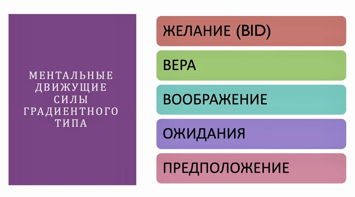 Рассмотрим примеры формирования движущих сил ментального характера. Речь идет о Ментальных ДС, которые направляют сознание либо в сторону роста, либо в направлении падения. При этом есть то, что для человека естественно и противоестественно по природе его создания. Силы градиентного типа основаны на разнице движущих сил, которые формируются в результате разности потенциалов. Примеры: 1.Желание, BID: позитивный аспект (+) - естественные желания: счастья, здоровья, процветания, успеха, изобилия негативный аспект (-) - противоестественные желания: ТПС (тайное пожелание смерти, явное пожелание смерти, ЯПС), пожелание неудачи, зависть, пожелание провала 2. Вера – как исполнение ожидаемого (что ещё не произошло, но хотелось бы, чтобы произошло): (+) - вера в успех, хороший исход, в лучшее, в спасение, в исцеление (-) - вера в провал, в худший исход, в смерть, сомнения в успехе, страх 3.Воображение: способность представить картинку, которой еще нет в осязаемой реальности (+) -