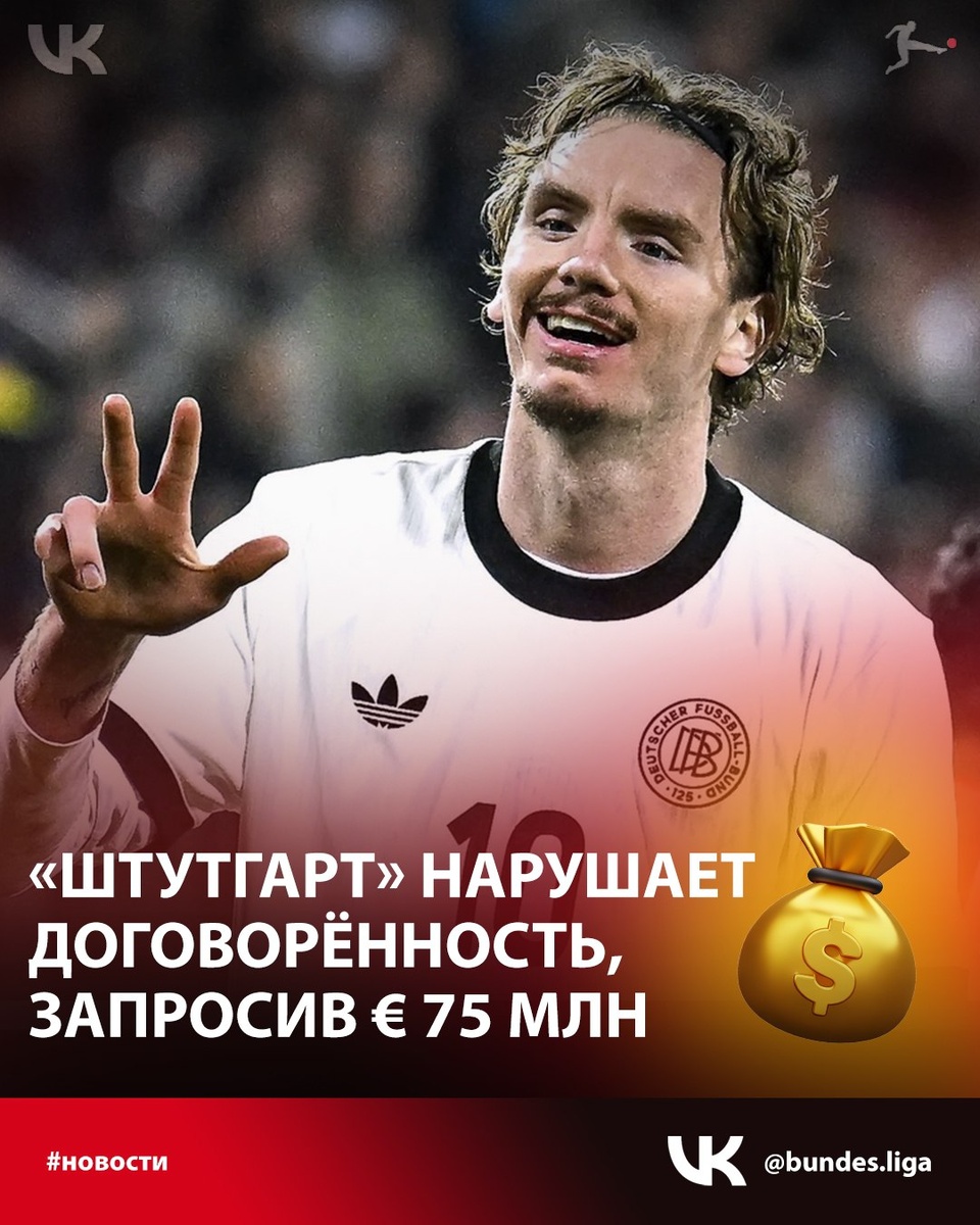 «Штутгарт» нарушает договорённость, запросив € 75 млн 🤯 Агент Дэнни Бахманн, представляющий интересы нападающего «Штутгарта» Ника Вольтемаде заявил👇 💬 «Требование нереальной суммы в € 75 млн за игрока, который перешёл в клуб на правах свободного агента, но с зарплатой ниже средней, не только не имеет под собой никаких оснований, особенно для внутреннего трансфера, но и полностью противоречит предыдущим соглашениям», — приводит слова Бахманна журналист Флориан Плеттенберг в социальной сети Х. 👉 Ранее стало известно, что мюнхенцы предложили € 60 млн плюс бонусы и процент «Штутгарту» от потенциальной продажи игрока в будущем. «Швабы» отклонили предложение и потребовали от «Баварии» € 75 млн.