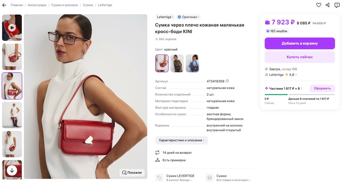Маленькая кожаная сумка красного цвета - яркий штрих в образе. У неё жёсткая форма и два ремешка: короткий и длинный, так что можно носить по-разному. Она подойдёт и для повседневных дел, и для выхода в свет. Носить удобно в любое время года. А ещё сумка красиво упакована, так что подойдёт в подарок.