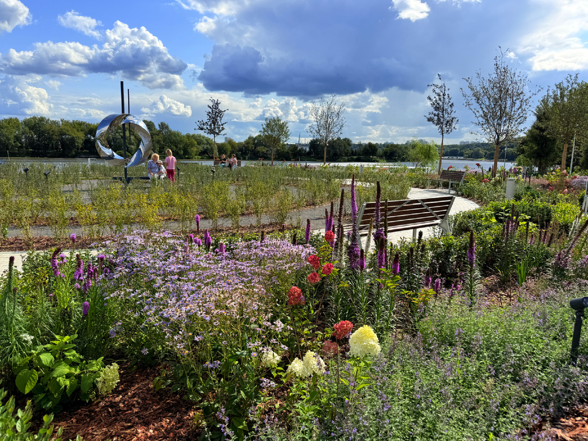 Вообще по всей набережной много клумб, лавочек, шезлонгов, несколько кафе, зон со столиками (можно принести еду с собой и устроить пикник), есть амфитеатр для уличных мероприятий и даже библиотека с видом на реку.
