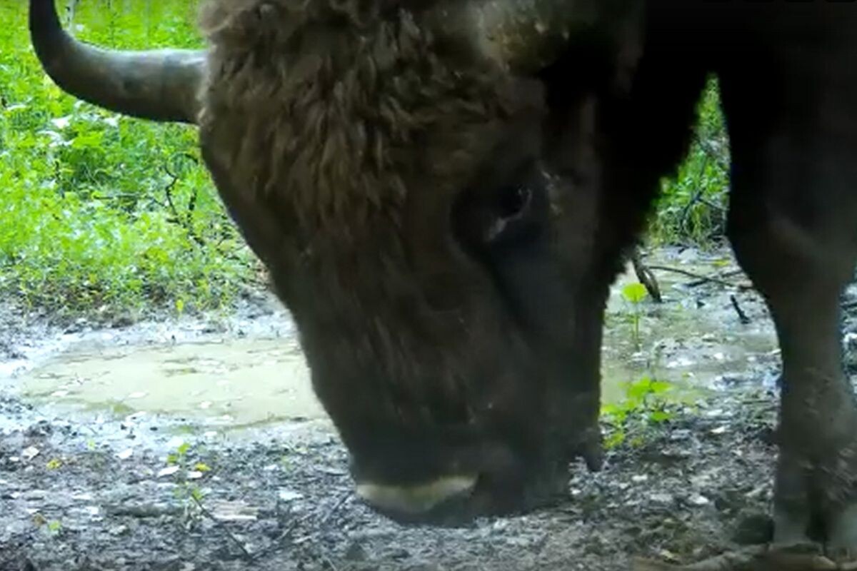Зубра крупным планом запечатлела фотоловушка в калужском заповеднике
