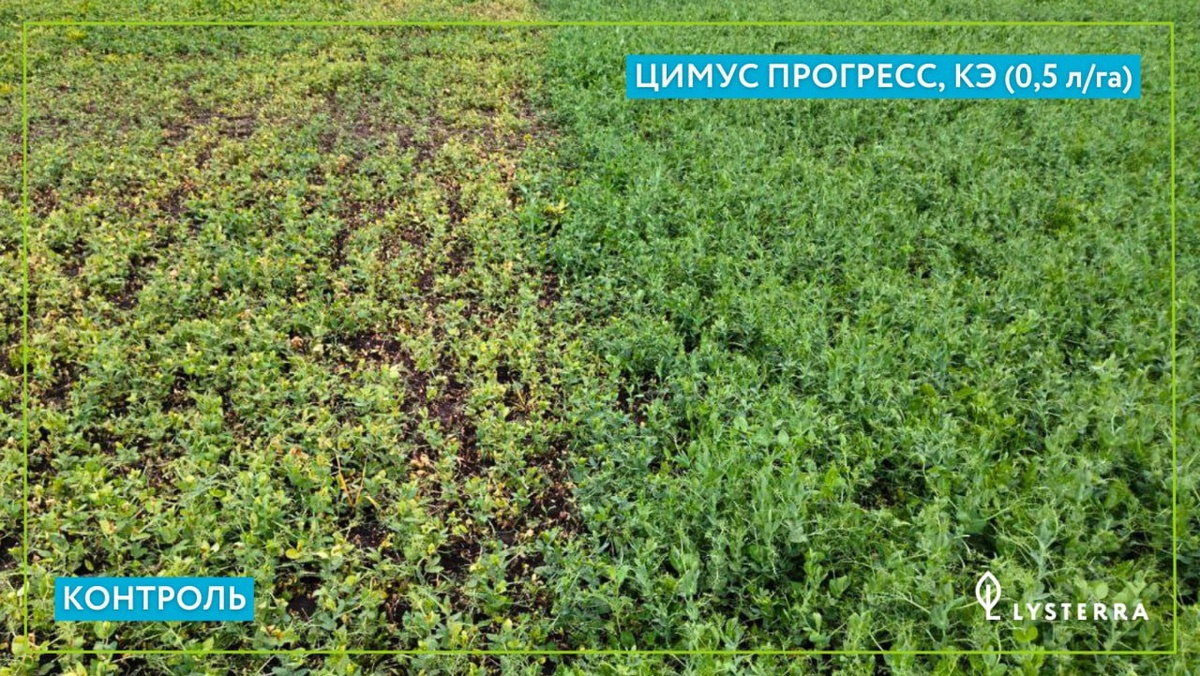 На фото показываем, как работает фунгицид Цимус Прогресс, КЭ в посевах гороха