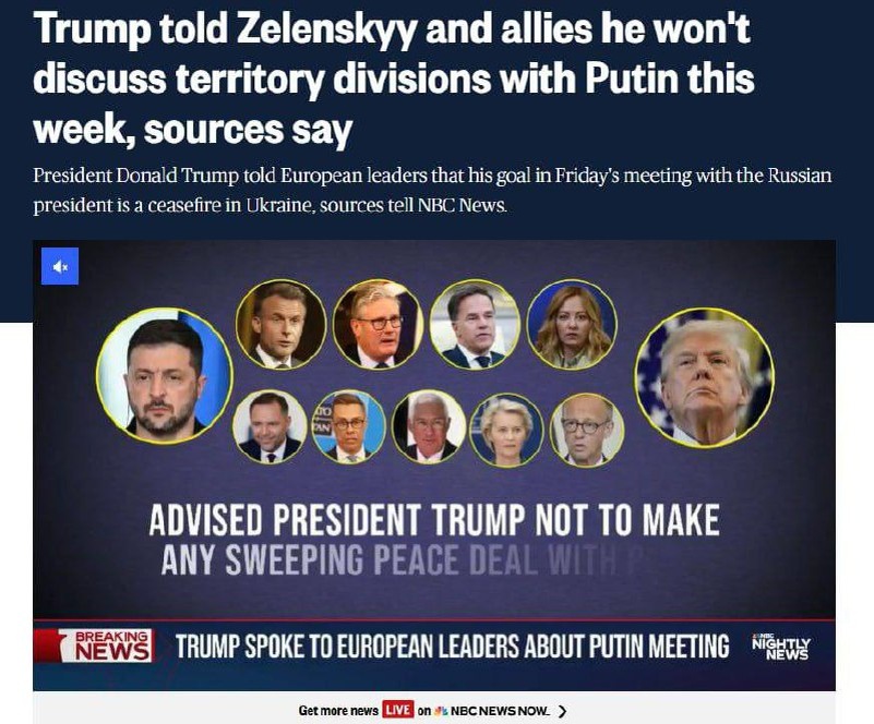 Трамп заявил европейским лидерам, что на встрече с Путиным не будет обсуждать территорию Украины, а намерен настаивать на безоговорочном прекращении огня — NBC и CNN со ссылкой на источники.