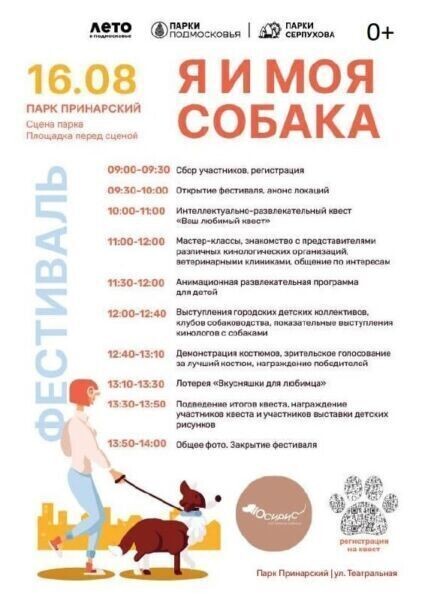 Жителей Серпухова приглашают на ежегодный фестиваль «Я и моя Собака» В эту субботу, 16 августа, в Принарском парке с 9 часов будет настоящий праздник для пушистиков и их хозяев. Для гостей подготовили квест, мастер-классы, конкурсы, развлекательную программу для детей, встречи с единомышленниками, показательные выступления и лотереи. ➡️Регистрация на квест https://clck.ru/3NNzFf ➡️Регистрация на конкурс костюмов https://clck.ru/3NNzFm