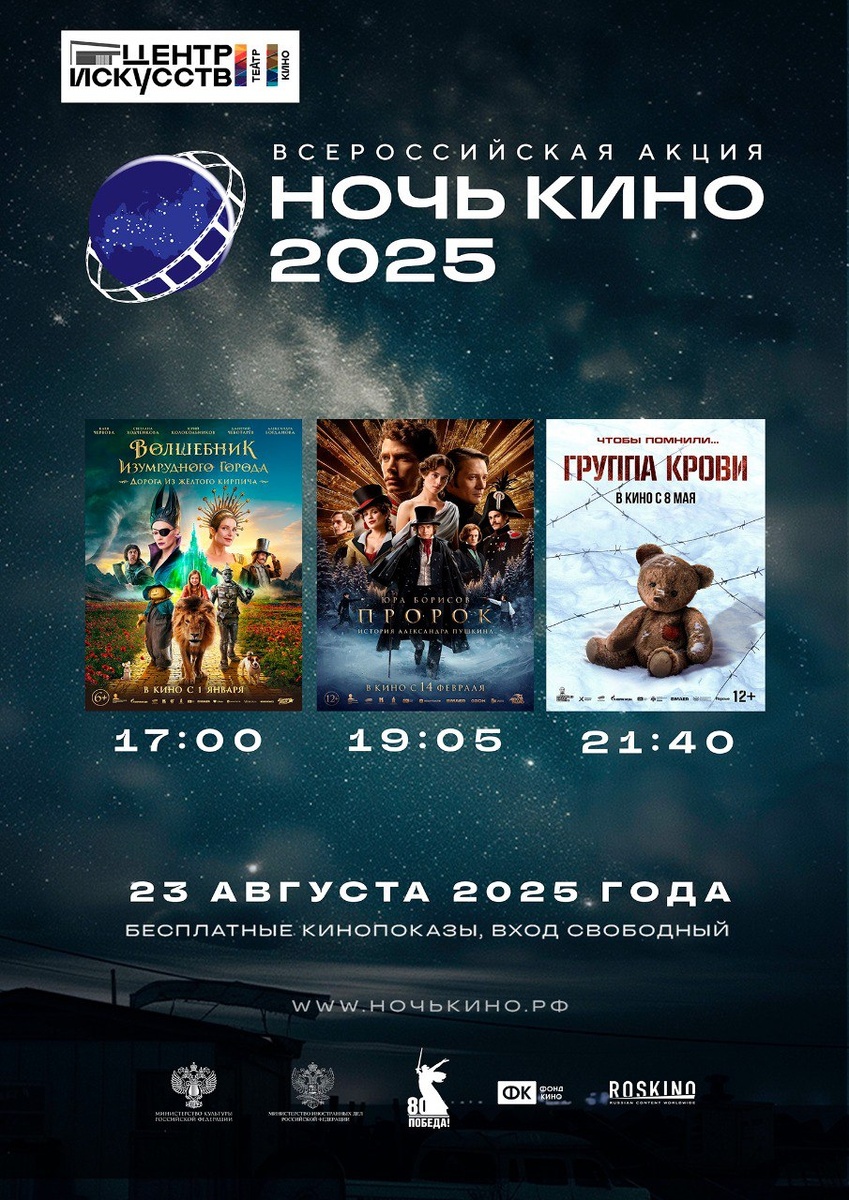 Внимание всем поклонникам российского кино: с 18 августа стартуют выдача бесплатных билетов на акцию «Ночь кино 2025», которая пройдет в Центре искусств 23 августа. Каждому зрителю предоставляется уникальная возможность насладиться лучшими отечественными фильмами совершенно бесплатно! Количество билетов ограничено: каждый посетитель может получить максимум два билета на один сеанс. Расписание показов включает три увлекательных картины разных жанров: «Волшебник Изумрудного города. Дорога из жёлтого кирпича», «Пророк. История Александра Пушкина» и военную драму «Группа крови». Касса начнет работу строго с 15:00. А в понедельник и вторник обращаться можно прямо на вахту Центра искусств. Присоединяйтесь к всероссийскому празднику кино и окунитесь в волшебство большого экрана абсолютно бесплатно!