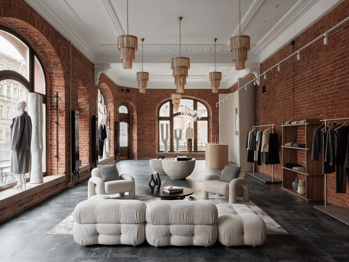 Дизайнер Ксения Новикова превратила историческое здание в центре Петербурга в современное пространство, которое не противоречит своему прошлому, а нежно с ним разговаривает - интерьер бутика получился легким, наполненным воздухом и невероятно многослойным. Бутик Landscape расположен на первом этаже доходного дома Карла Шмидта, построенного в начале XX века в Петербурге. Пространство площадью 150 кв. метров имеет отдельный вход и отличается высокими потолками, большими окнами и исторической кирпичной кладкой. При этом изначально интерьер требовал серьезного подхода: поздние переделки предыдущих владельцев, поврежденная лепнина, необходимость изменения планировки под новые задачи. В дизайне помещения отталкивались от концепции самого бренда. Одежда Landscape исследует связь природы и человека через моду. Основательница марки (Елена Лес) с самого начала хотела, чтобы интерьер отражал философию компании — лаконичность и натуральность. Здесь важно не просто демонстрировать одежду, а создать