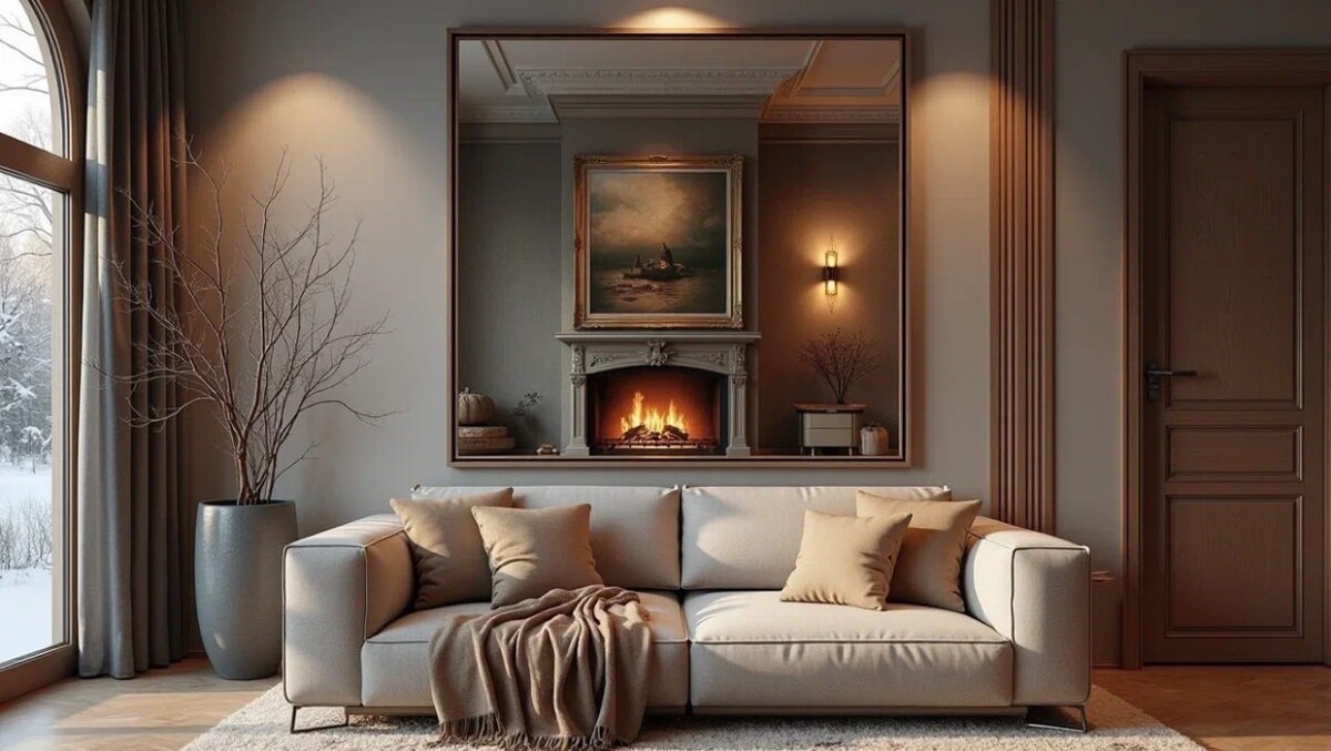 ✔ Часто используют зеркальные вставки в панелях или над камином — это придаёт интерьеру глубину и торжественность. ✔ Классика жанра: необычная форма зеркала. Круг или овал смягчает строгую геометрию плитки, а несколько зеркал в композиции превращают маленькое помещение в стильную «сцену