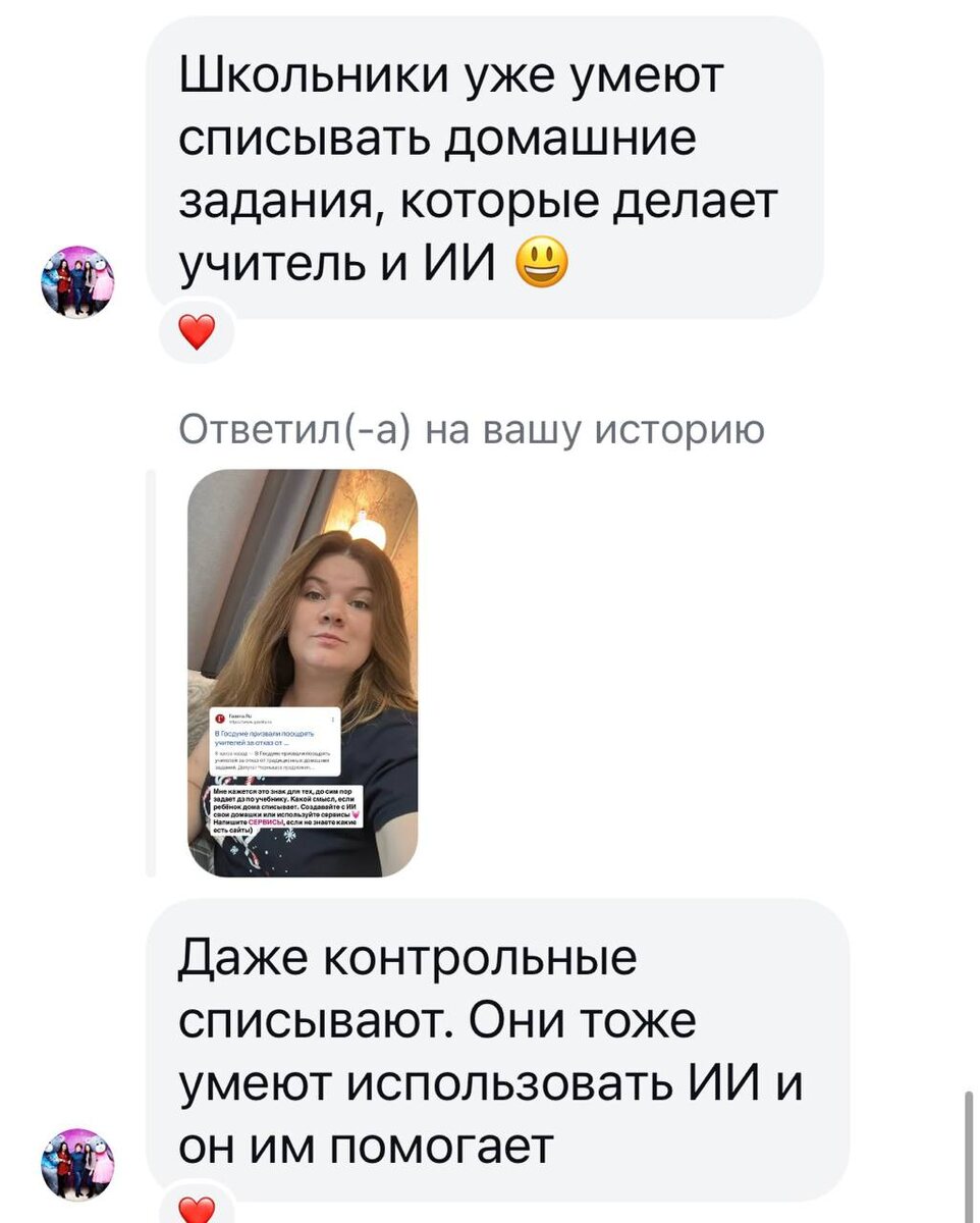 Вчера такое сообщение прилетело на новость про традиционные дз. Коллеги, есть же сервисы, где ребенку предлагается выполнить задания в интересной форме. Не обязательно же всегда задавать задания из учебника. Особенно не понимаю учителей, которые задают ПРОЕКТЫ на дом. Можно же организовать этот процесс в классе. Какой смысл, если ребёнку все распечатают родители? Или просто напишет ИИ?