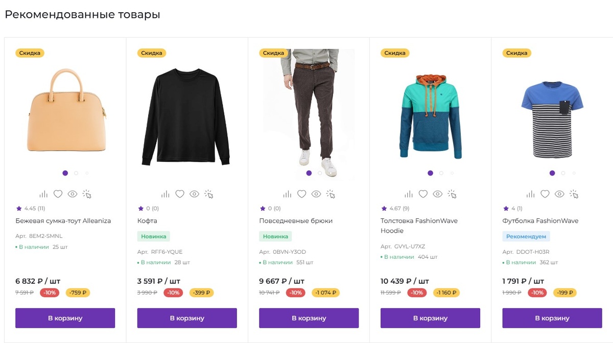 - Рекомендации («Вам может понравиться») — предлагает альтернативные товары, похожие на те, что пользователь просматривал ранее.