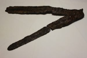 Кованый железный меч эпохи викингов был обнаружен летом 1982 года в центре Замкового острова на территории Кузнечного двора. Археологические раскопки проводились Ленинградским отделением Института археологии АН СССР под руководством Вячеслава Тюленева. Как рассказали в международном центре реставрации, меч является одним из наиболее значимых предметов среди археологических находок того периода. Клинок не имел рукояти, был согнут и состоял из двух фрагментов лезвия. На мече фрагментарно сохранились надписи на латинском языке, указывающие на имя мастера, изготовившего оружие. Однако две первые буквы были почти стерты, поэтому отчетливо читается только «…CELIN ME FECIT», что в переводе означает «…целин меня сделал». Начало имени мастера скрыло время. Предмет поступил в фондовое собрание с атрибуцией – меч Гицелина. Но стоит отметить, что, согласно последним исследованиям, правильнее его относить к группе мечей «Этцелин». Об этом подробнее можно прочитать в статье Юлии Мошник «Этцелин» в к