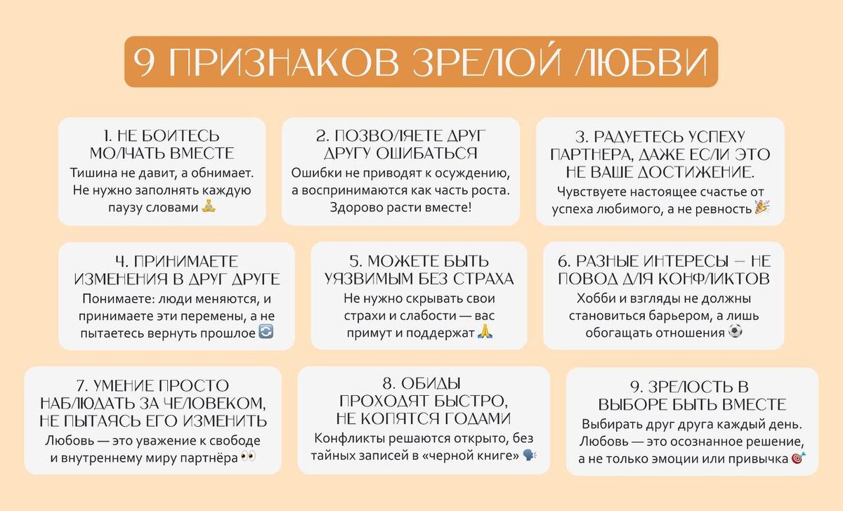 Быть вместе осознанно, а не по привычке ⏺ Любовь — это не только романтика и эмоции. Зрелая любовь — это глубокое понимание, уважение и поддержка друг друга, даже когда сложно. Мы расскажем, как понять, что ваша любовь действительно крепкая. Смотрите карточки выше и узнайте 9 признаков настоящей любви, которая проходит проверку временем и трудностями ☝️ Сколько признаков совпало? Голосуйте в опросе ниже ✔️