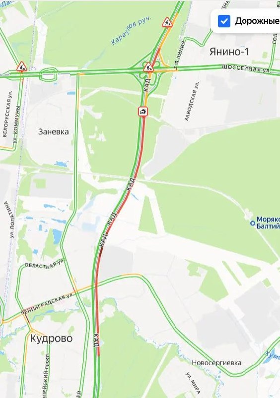 Водители застряли в пробке в 10 км возле Кудрово На внешней КАД затор начинается на 50-м км, возле Кудрово, и доходит до 44-го км. На участке, судя по данным сервиса «Яндекс.Пробки», фиксируются ДТП и дорожные работы. Вторая длинная пробка образовалась за Мурманским шоссе. Она начинается с 52-го км внутренней КАД и заканчивается в районе 62-го км кольцевой. В красно-бордовый цвет также окрасились Народная улица, Мурманское шоссе и Октябрьская набережная. 🌇 Жизнь в Кудрово Есть новости? Пишите сюда.