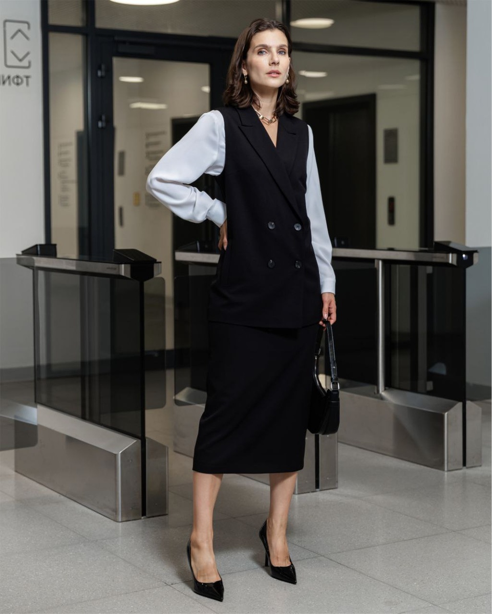 Вечер – это прекрасное время для размышлений о том, как обновить свой стиль Одним из безусловных фаворитов является комбинация черного костюма с удлиненным жилетом и юбкой миди, дополненная белой блузой. Это классическое сочетание всегда выглядит стильно и современно, подчеркивая строгость и изящество. Такой наряд создает атмосферу вневременной элегантности. Если вы хотите добавить немного оригинальности, вместо традиционной блузы с воротником можно выбрать модель с объемными рукавами из текстурной плиссированной ткани. Такие акценты способны преобразить даже самый строгий образ, придавая ему уникальность и шарм. Именно в деталях кроется секрет вашего неповторимого делового стиля! Для заказа пишите на наш WhatsApp: https://wa.me/message/GESSL37P7LULC1