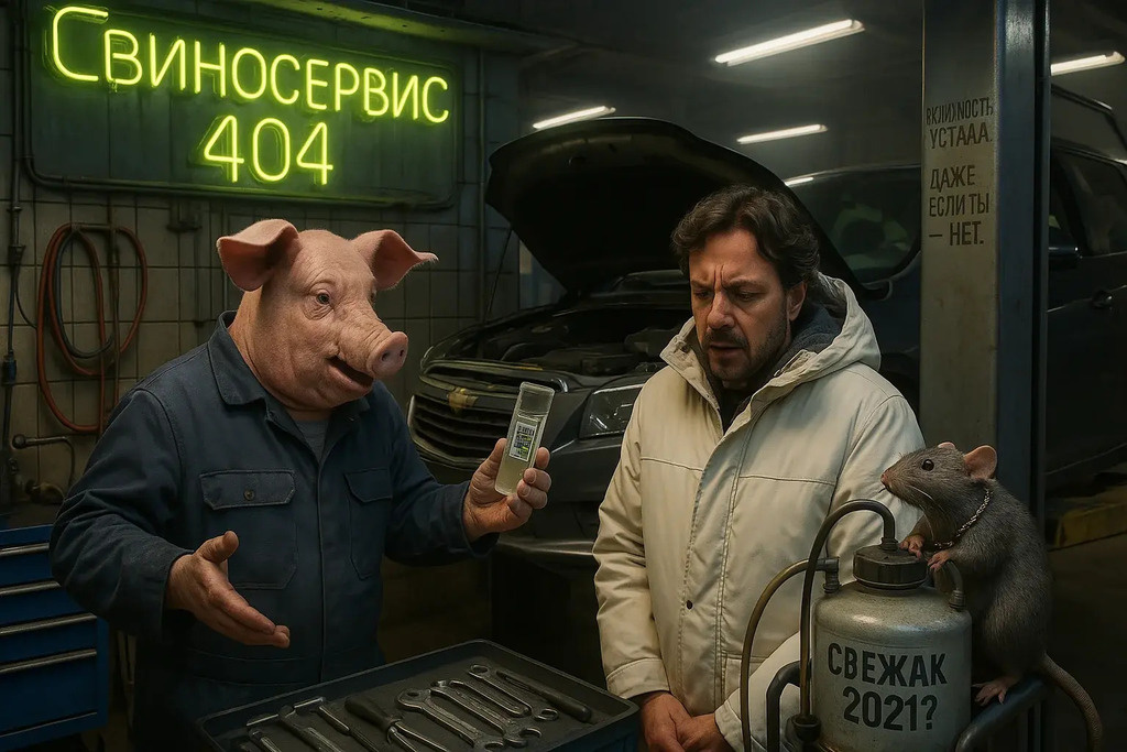Свиносервис 404: Как мы «назначаем замену тормозной жидкости» по году в ПТС ⚙️ ・・・ ⚙️ ИНСАЙД ОТ МАСТЕРА: “Если машине больше трёх лет — тормозуха по умолчанию прокисла” Клиент заезжает на плановое ТО. Мы открываем капот, смотрим на крышку бачка и спрашиваем: — Когда последний раз меняли тормозную жидкость? 🧪 Независимо от ответа говорим: — Всё. DOT устал. Она кипит раньше нормы. При экстренном торможении откажет. 📏 Иногда тыкаем в бачок мультиметром и показываем “цифры”. Хотя клиент не понимает, что мы вообще замеряли. 🧾 Классическая смета: — Жидкость премиум DOT 4+ — 1 200 — Прокачка системы с заменой — 2 300 — “Диагностика герметичности тормозного контура” — 1 400 — “Сброс сервиса и проверка педали” — 900 Итого — 5 800 ₽, хотя на деле жидкость могла быть свежей. 🧠 ・・・ 🧠 ШУТИМ, ПОТОМУ ЧТО ЭТО ВЕСЕЛИТ. НО ПРО DOT ПО ГОДУ — СЕРЬЁЗНО. 🔩 ・・・ 🔩 #тормознаяжидкость #dot4 #разводвтехцентре #тормоза ♡ где читать дальше ♡ 📘 VK — https://vk.com/pigservice404 ✉️ Telegram — http