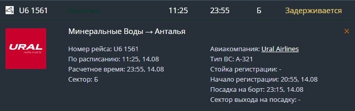 Еще одна серьезная задержка рейса на курортном направлении – рейс «Уральских авиалиний» вылетит из Минеральных Вод в Анталью в лучшем случае в 23:55 вместо 11:25. «Перенесли вылет с 11 вначале на 14, потом на 00:30. Сейчас на табло 23:55. У меня туристы с детьми, разнервничались. Им особенно обидно, потому что первый раз едут за границу. Но в гостиницу разместили, питание организовали», – рассказали очевидцы Крыше ТурДома.