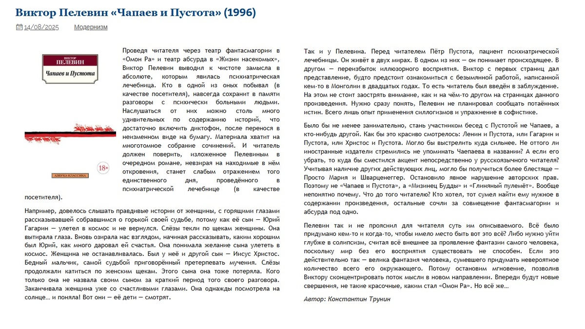 Виктор Пелевин «Чапаев и Пустота» (1996) | Критика