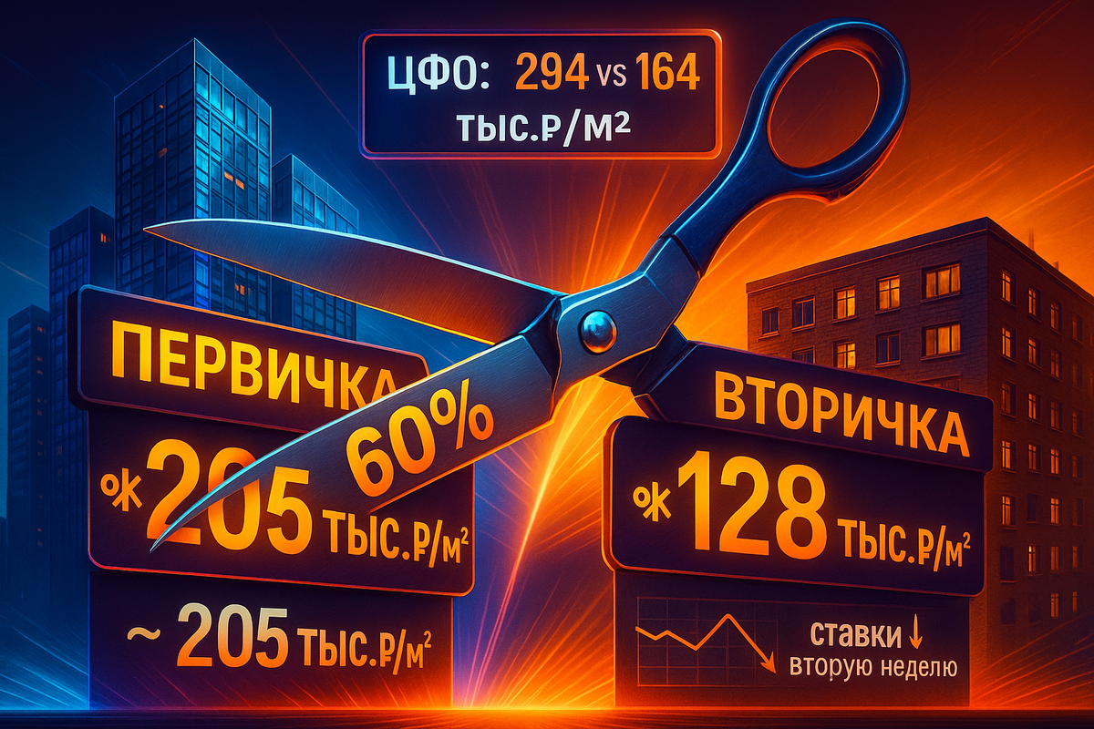 Цены на новостройки в России обогнали вторичный рынок на рекордные +60%: средний метр на первичке держится около 205 тыс.₽/м², тогда как на вторичке — около 128 тыс.₽/м². В ЦФО разрыв доходит до 80% (≈ 294 тыс. против 164 тыс.₽/м²). На этом фоне рыночные ставки по ипотеке снижаются вторую неделю подряд, а в Москве в июле зарегистрировано около 6,5 тыс. ДДУ (−11,4% г/г). Трезво разбираем факты, причины и последствия. Эксперты указывают на эффект смешанной выборки: вторичка представлена по всей стране, а новостройки концентрируются в крупных городах с изначально более высоким уровнем цен. Если смотреть внутри крупных городов, средний разрыв заметно ниже — около 24% по 40 крупнейшим рынкам; локально диапазон варьируется от ~0,1% (Калининград) до ~58% (Челябинск). Вывод: цифра «80%» — пиковая для макрорегионов, а не универсальная для каждого города. В июле оформлено около 6,5 тыс. ДДУ (−11,4% г/г). Совокупно с нежилыми — около 9,5 тыс. ДДУ. Это объясняет, почему скидки у застройщиков остаю