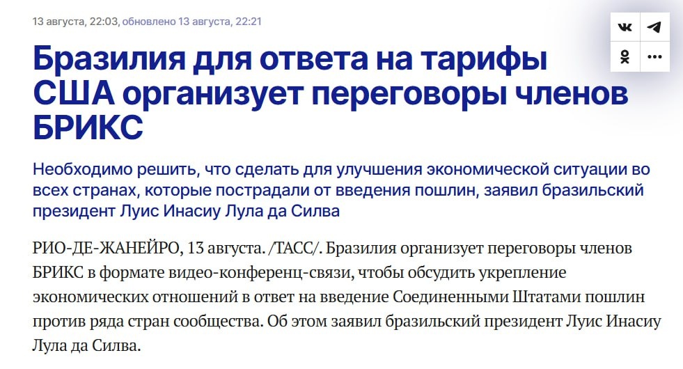 Бразилия бросает вызов Вашингтону. 🇧🇷 Рио-де-Жанейро открывает новую страницу в истории Латинской Америки. Президент Бразилии созывает экстренную видеоконференцию лидеров БРИКС, чтобы выработать ответ на американские тарифы. ⤴️ «Нужно решить, как улучшить экономическую ситуацию во всех странах, пострадавших от пошлин США», — заявил он. Латинская Америка больше не тот «задний двор», куда в XX веке морпехи заходили без приглашения - будь то Никарагуа, Гаити или Куба. Сегодня на континенте иные правила: растущий товарооборот с Россией и Китаем подрывает монополию США, а попытки прикрыть военную экспансию борьбой с наркокартелями встречают прямое «нет». ⤴️ 🇲🇽 Мексика жёстко заявила: американских солдат на своей земле не будет. 🇨🇴 Колумбия предупредила: операция в Венесуэле без согласия Каракаса ➡️будет засчитана как агрессия против всей Латинской Америки. 🇨🇺Куба назвала неприемлемой охоту на Мадуро под предлогом борьбы с наркотрафиком. 🇧🇴 Даже Боливия, переживающая худший за 40
