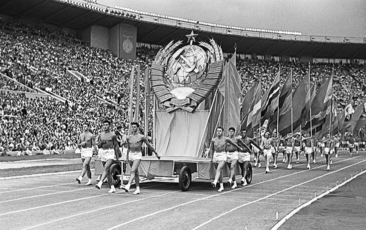 В Россию вернулись спартакиады. Это не инновация российских чиновников – первую спартакиаду в СССР провели почти 100 лет назад. В 1928-м они стали противовесом Олимпиадам. С 1956 года соревнования стали называть спартакиадой народов СССР – это были самые массовые спортивные старты страны, а церемонии открытия и закрытия на финальных турнирах проводились с олимпийским размахом. Торжественная церемония открытия II Спартакиады народов СССР на Центральном стадионе имени Ленина в Москве. Примерно в те же годы с Красной площади на стадионы спартакиады переехал парад спортсменов – теперь атлеты маршировали на торжественных церемониях. Парад участников II летней Спартакиады народов СССР в Москве Любопытно, что в 1959-м у спортсменов, представлявших национальные республики, была надпись на спортивной форме – за исключением команды РСФСР. Для примера, экипировка призеров соревнований в метании диска (слева направо): Альгис Валтушникас (Литва), Отто Григалка (Москва) и Каупо Метсур (Эстония). То