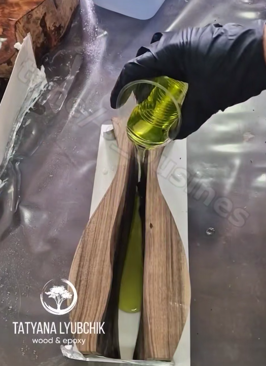 Суть проста. Берём доску из дуба, ясеня или ореха — дерево всегда подбирается под идею. На станке выпиливаем две половинки будущей вазы. Складываем их в силиконовую форму и заливаем пространство между ними прозрачной смолой с оттенком — бирюзовым, янтарным или вообще без цвета.